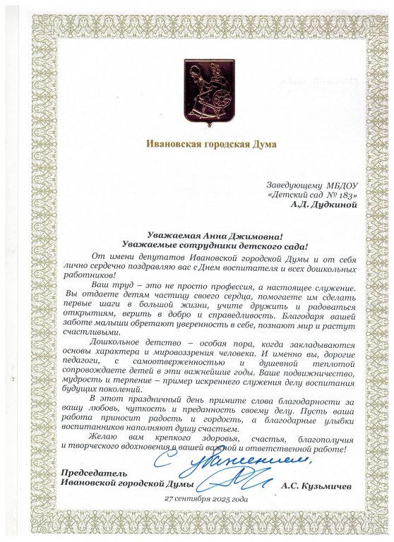 Сегодня наш коллектив с Днем дошкольного работника поздравил депутат Карлявин Михаил Вадимович, выразив признательность за самоотверженную работу и заботу о детях. Вручил Благодарность Ивановской городской Думы Мухтаровой Севде Думановне и передал поздравление от Председателя Ивановской городской Думы Кузьмичева Александра Станиславовича.